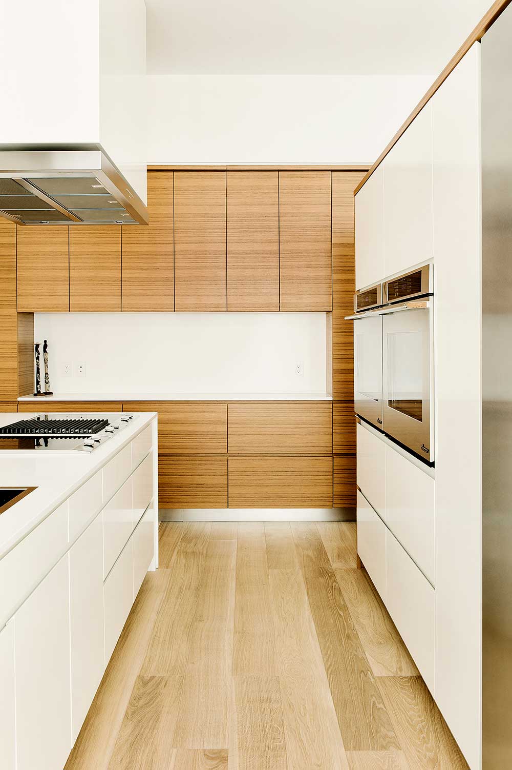 Ce projet se voulait une ode au design minimaliste et contemporain. L’alliance du teck et de la laque blanche matte enveloppe l’espace et crée une horizontalité apaisante soutenue pas des poignées intégrées au mobilier.